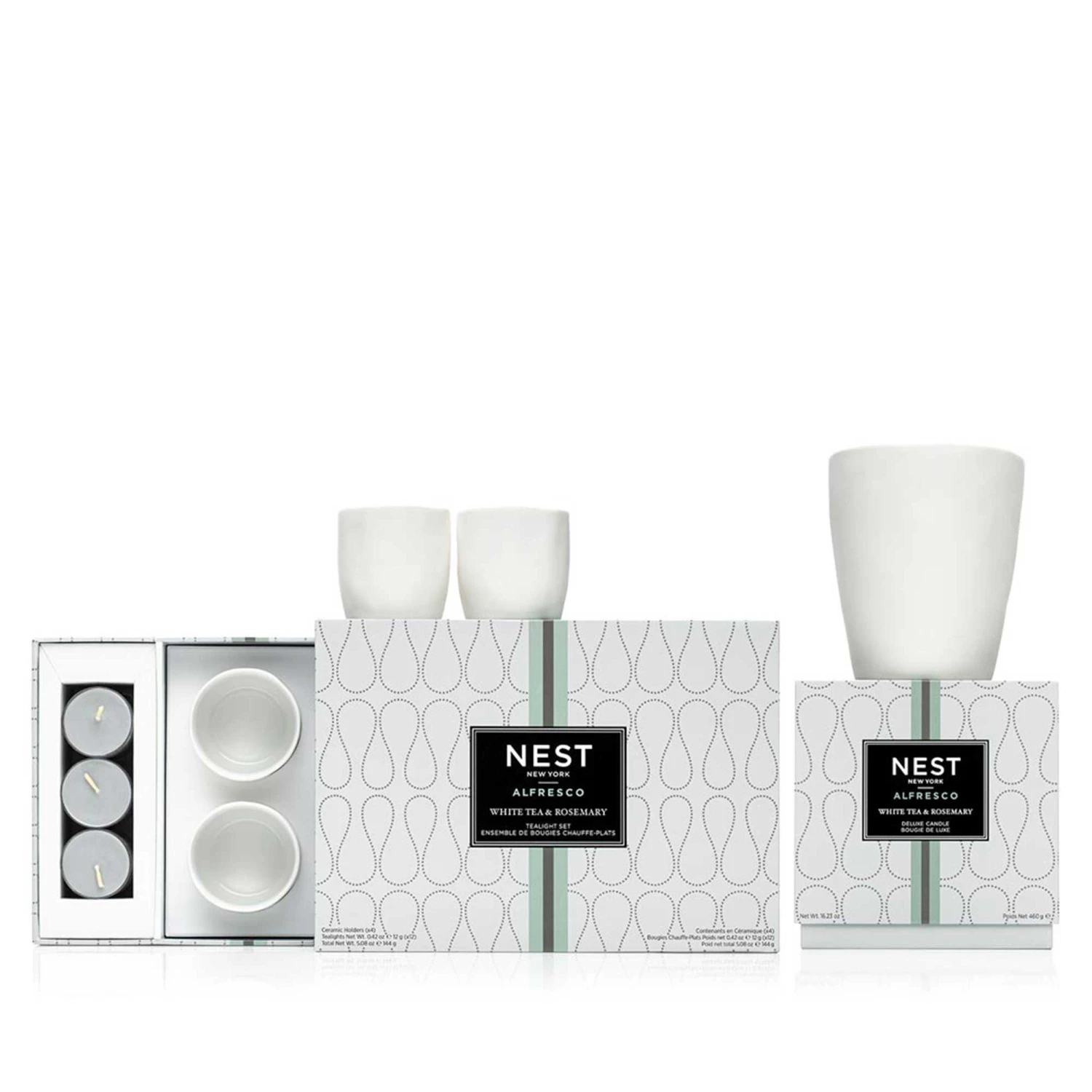 Discover our Alfresco Collection, White Tea & Rosemary, with this Deluxe Candle & Tealight Set featuring notes of white tea, rosemary, cedarwood, and a hint of crisp mint, a fresh herbal scent known to naturally deter insects.