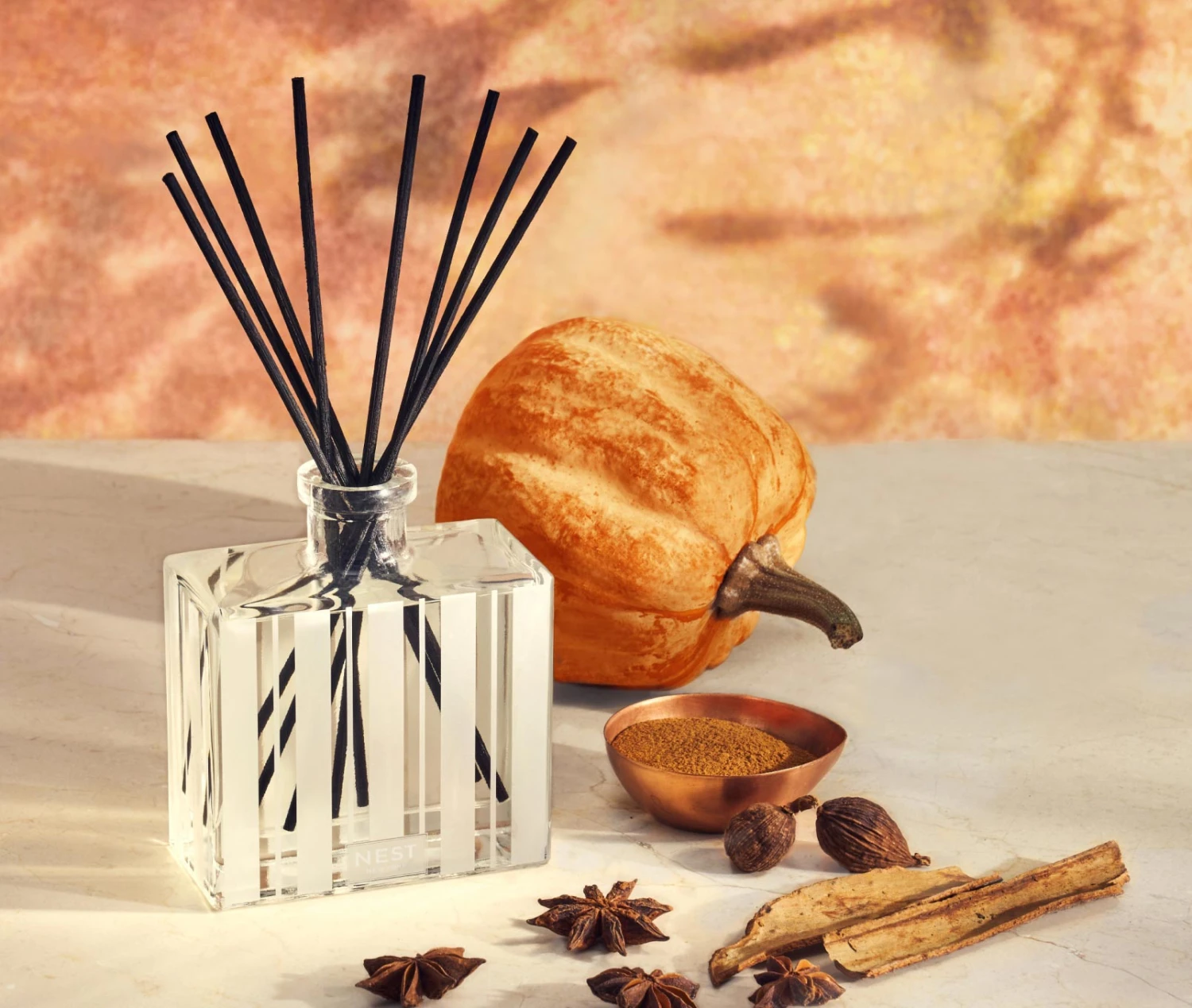 Create a cozy autumn ambiance with this exquisitely fragranced Reed Diffuser featuring a blend of wild pumpkin, spicy masala chai, cardamom, ginger, and cinnamon.Â