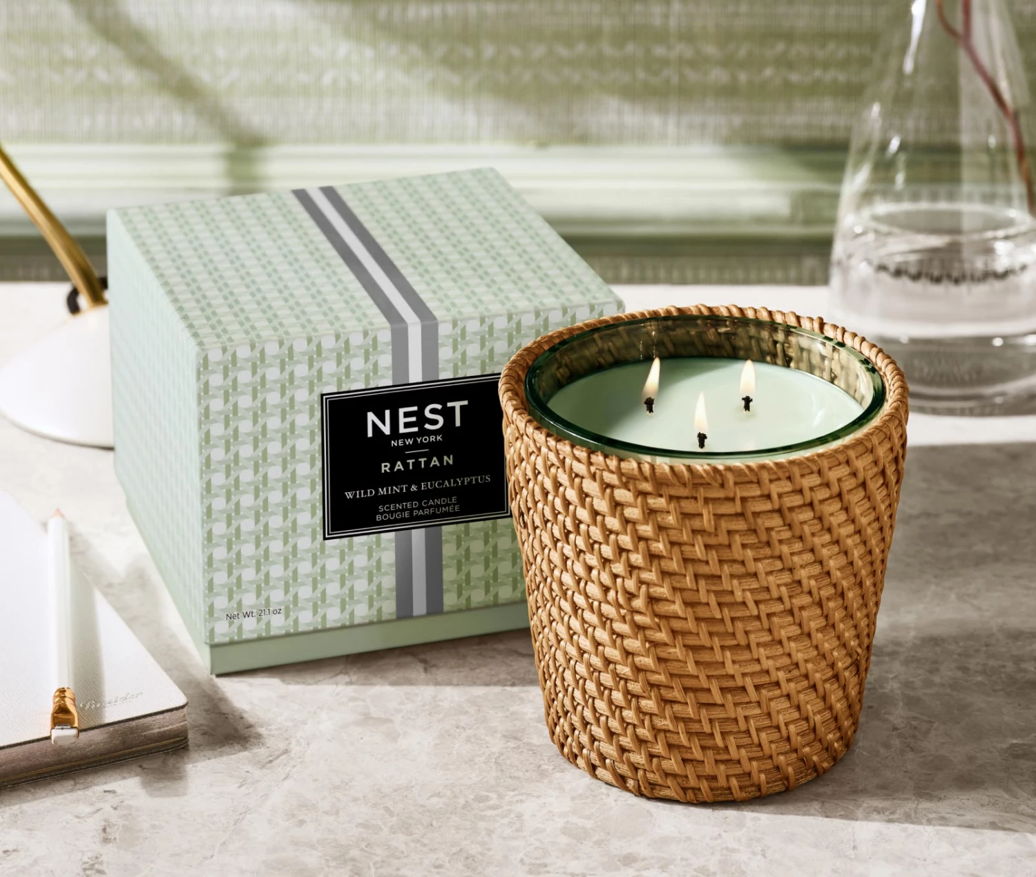 Clear your mind and awaken your senses with this limited-edition Wild Mint & Eucalyptus 3-Wick Candle featuring a removable rattan sleeve.
