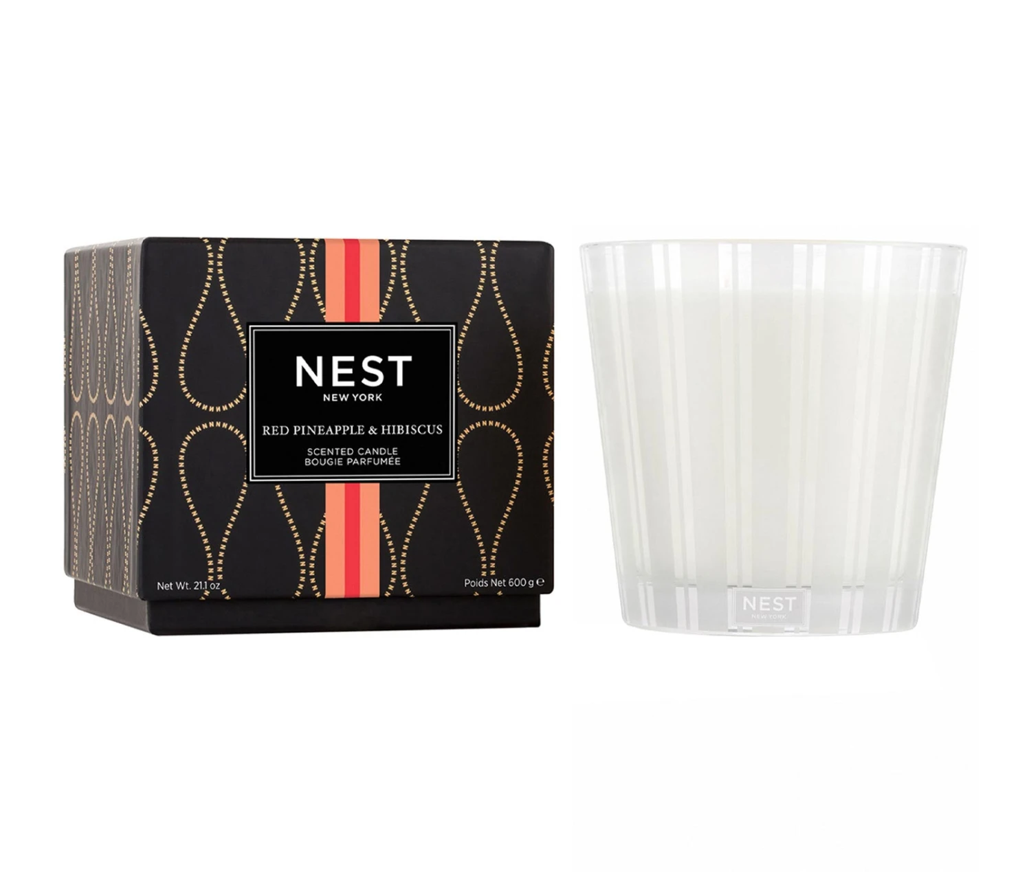Available exclusively on nestnewyork.com, this scented candle captures the aromas of an island getaway with a tropical blend of red pineapple and white nectarine combined with notes of hibiscus and cedarwood.